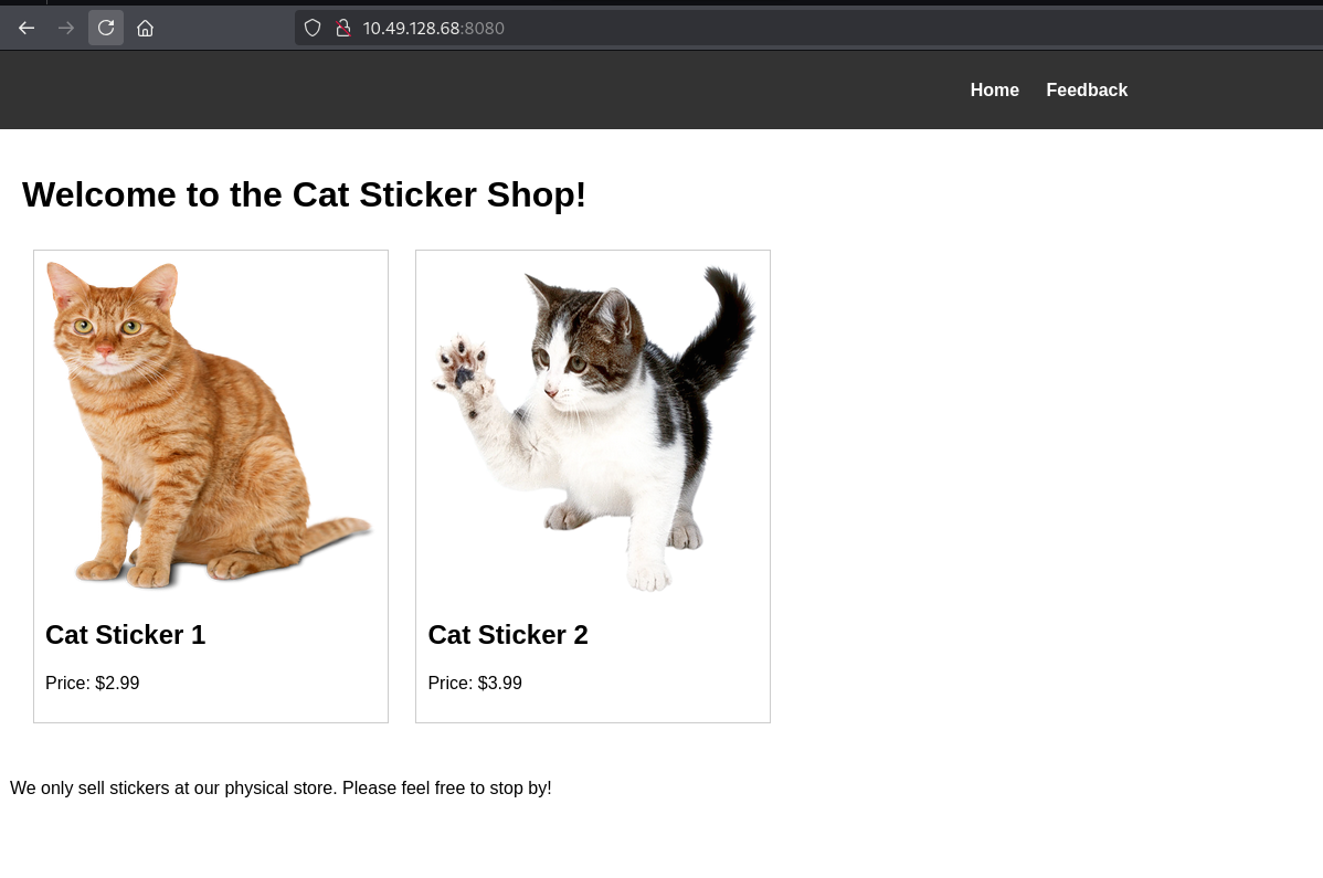 The web application running on port 8080 was a “Cat Sticker Shop” - cute, but potentially vulnerable.